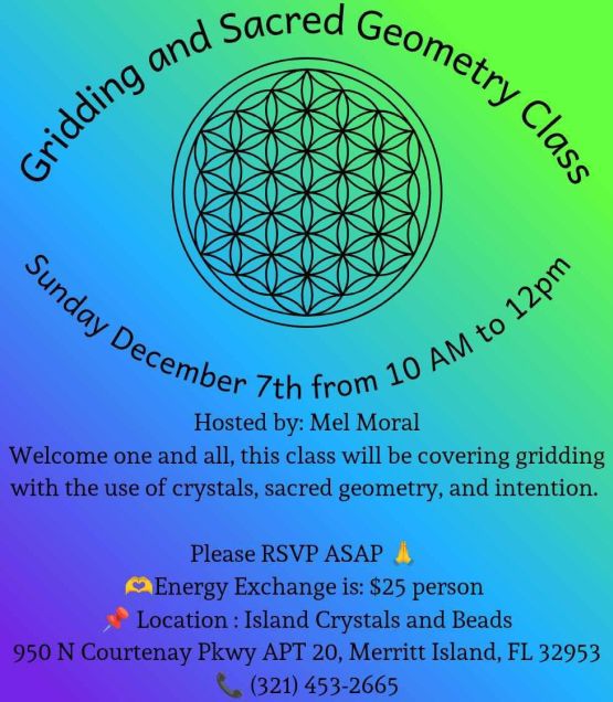 « All Events Gridding and Sacred Geometry Class December 7 at 10:00 am - 12:00 pm $25 « Readings with Melissa Reiki Circle » Come Join us! $25 per person, call 321-453-2665 to reserve your spot. Add to calendar Google Calendar iCalendar Outlook 365 Outlook Live Details Date: December 7 Time: 10:00 am - 12:00 pm Cost: $25 Organizer Mel Moral Venue Island Crystal & Bead 950 N. Courtenay Pkwy #20 Merrit Island, FL 32953 United States + Google Map Phone 321-453-2665 View Our Full Event Schedule Here